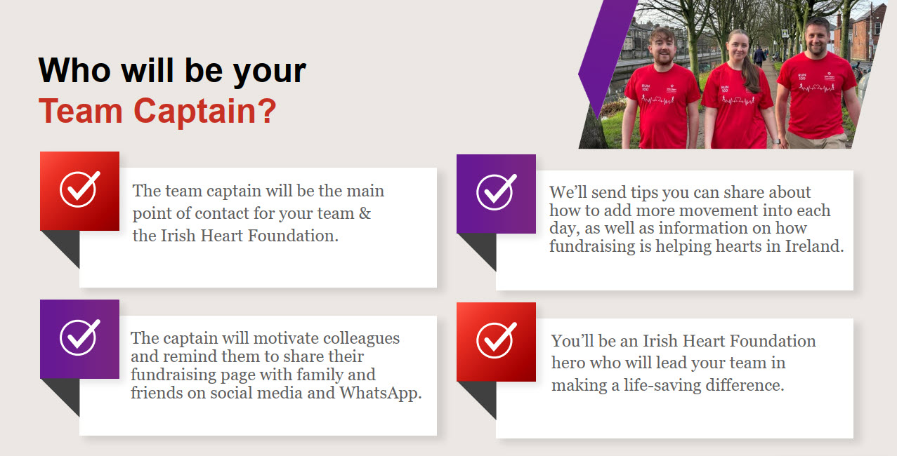 The first step is to choose your team captain. They should fill out the registration form to create their own page and also create a new team and team password. The team captain can then share the sign-up link with team members, and let them know the team name and password. Once each team member has signed up, they will have their own personal page for fundraising and logging steps.